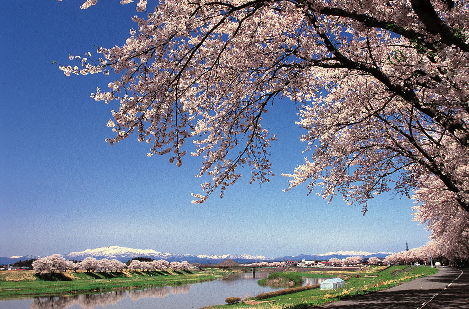 春の迫川 後ろには栗駒山が見える(若柳地区)