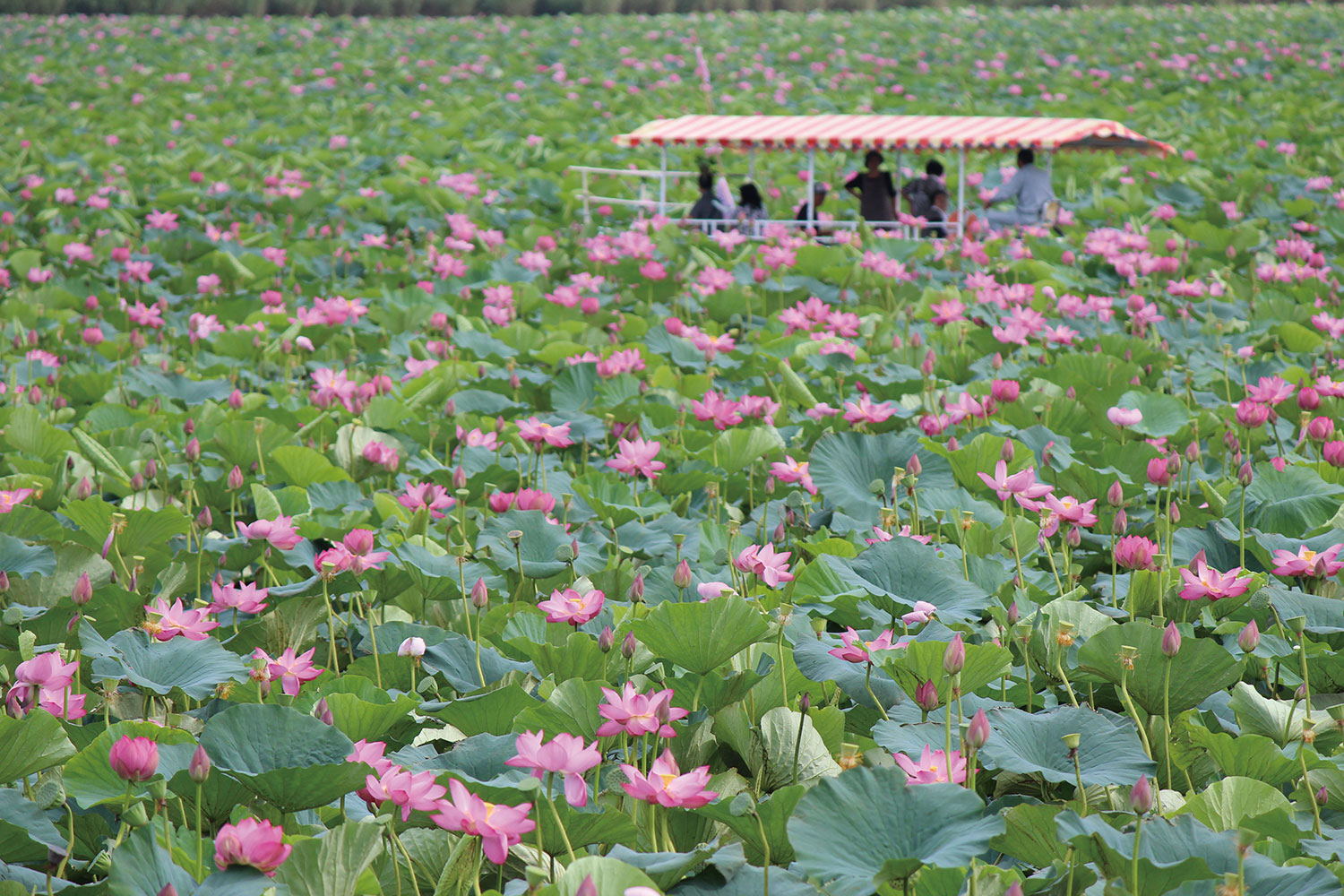 満開のハスの花がさいた夏の伊豆沼・内沼