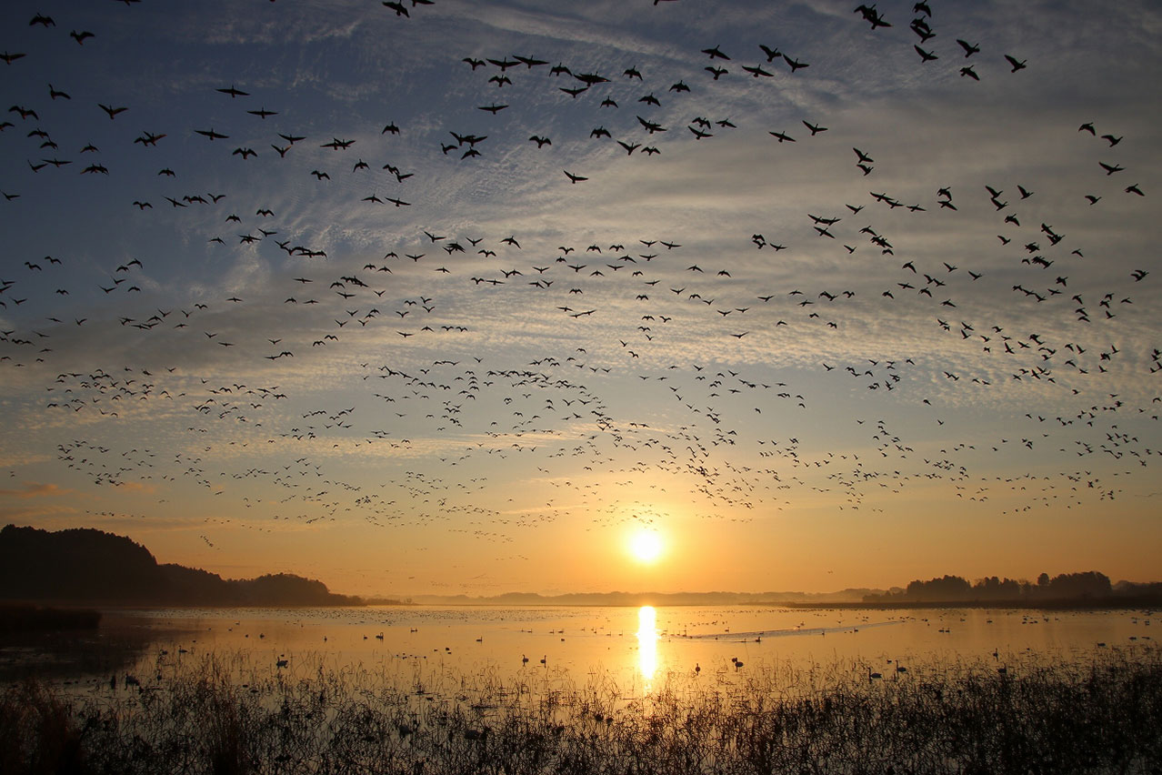 朝日とともに伊豆沼・内沼からえさ場へ飛立つマガン